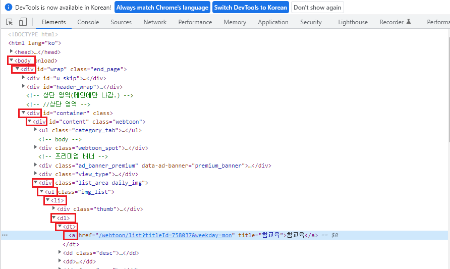 ( HTML의 코드를 보여줍니다. 네이버 월요웹툰 URL 입니다 )