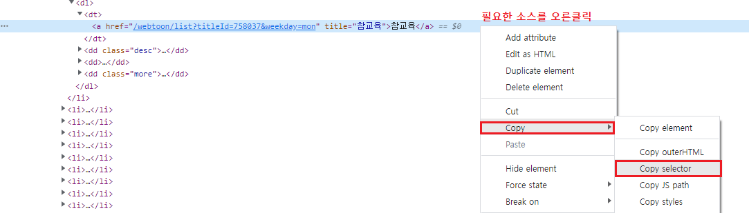 해당 방법으로는 <dt> class 에 포함된 모든 <a>를 불러옵니다